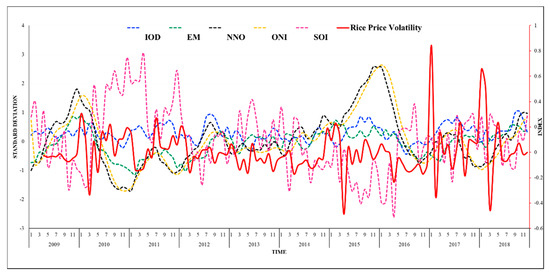 The climate data approach used to identify the value of price volatility shows relatively strong interactions. These price shocks appear in line with the time series of climate anomalies. A strong El Nino effect, as measured by the ONI and Nino 3.4, indicates strong price shocks in the Indonesian region from late 2009 to the early La Nina conditions that followed. Volatility returned to a slope but then La Nina strengthened in late 2010 to early 2011, causing the volatility to bounce back. These two things show the strength of the interaction between Indonesia and climate dynamics in the Pacific Ocean, in the form of both rainfall and an increase in extreme events that impact price volatility. The strong La Nina year in 2015 also showed intense price volatility. However, apart from climatic factors, such as rice prices, volatility in 2018 tended to be dominated by macroeconomic factors. El Nino and La Nina affected rice conditions but did not cause fluctuations, because conditions neutralized the value of price volatility [33,34]. The development of climate dynamics can be identified, which can influence volatility.