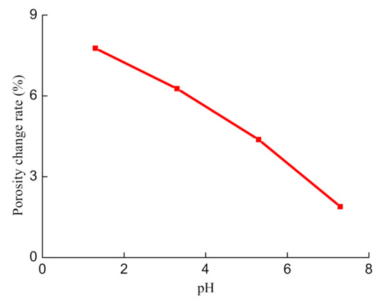 Table 2 shows the initial porosity, the porosity change rate after chemical solution corrosion, and the damage parameter of mudstone. The trend between the average porosity change rate and pH is shown in Figure 2. The porosity change rate of rock samples decreases nearly linear with the increase of pH. The porosity change rates of groups A, B, C, and D are 7.77%, 6.27%, 4.38%, and 1.89%, respectively. The porosity change rate of group A is 4.11 times that of group D, the one in group B is 3.32 times that of group D, and the one in group C is 2.32 times that of group D. Acidity has a significant impact on the porosity of rocks, and with the rise of acidity, the degradation of rocks becomes more evident. Note that group D is a neutral solution, and, after acid solution corrosion, the porosity change rate is 1.89%. The reason is that, after soaking in a neutral solution, the dissolution of water on the soluble minerals, such as some chlorides and some oxides (iron, aluminum oxides, etc.) in the rock allows the porosity of the rock to increase. The increase in porosity of groups A, B, and C is due to the chemical reaction of H+ with mudstone feldspar, calcite, and mica, and the resulting materials slowly overflow with an immersed solution. This overflow of material causes an increase in rock porosity. It is evident, from the microscopic point of view, that the shape and mineral composition of mudstone has improved due to chemical solution. The damage caused by chemical solution corrosion to mudstone is mainly due to the dissolution of soluble cement and the chemical reaction with its mineral composition. This reaction causes changes in the microstructure of mudstone, continuously forming damage, and finally resulting in the weakening of the mechanical properties. In this paper, the damage variable of porosity is used to define the corrosion damage degree of chemical solution corrosion to the mudstone specimen. The chemical damage parameter Dch was calculated as follows [26]: