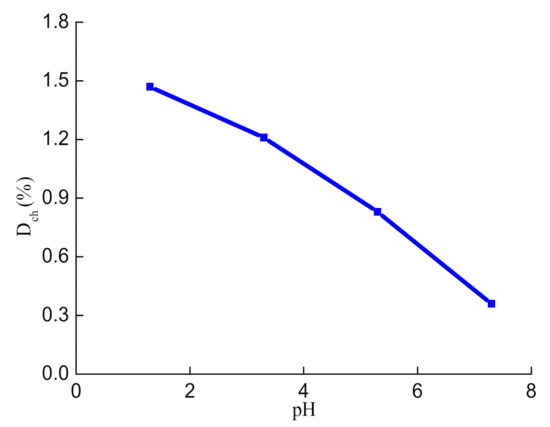 The microstructure and mineral composition of the mudstone samples have changed to different degrees after corrosion by an aqueous chemical solution. This change caused chemical damage to the samples, which decreased their macro mechanical parameters. The chemical damage variable Dch of the mudstone sample after corrosion in the acid solution was determined using Equation (3), and the relationship between Dch and pH was obtained as shown in Figure 3. The average value of the chemical damage variable Dch was taken from each rock sample group, and the pattern of variance of the chemical damage variable was drawn at the pH level. The rate of porosity change in rock samples decreased almost linearly with the rise in pH, as shown in Figure 3. After soaking in acidic solution, the chemical damage Dch of groups A, B, C, and D was 1.47%, 1.21%, 0.83%, and 0.36%, respectively. The chemical damage variable Dch of group A was 4.08 times that of group D, the one in group B was 3.36 times that of group D, and the one in group C was 2.31 times that of group D.