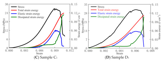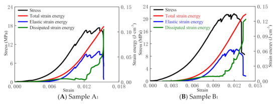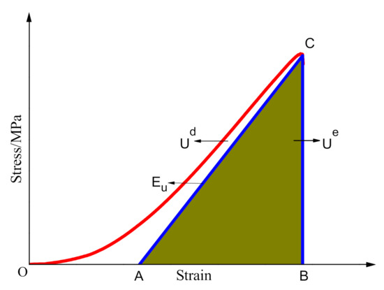 The strain energy characteristics during the loading process are intimately related to the deformation and failure of rock materials. Furthermore, since the dissipative strain energy and elastic strain energy increase and are released during the loading process, the rock failure usually occurs according to the energy perspective [1,2]. According to the law of thermodynamics, the process of strain energy dissipation is unidirectional and irreversible. The release of elastic strain energy is bidirectional and reversible under certain conditions. The dissipation of strain energy causes micro-damages to rocks, which weaken their mechanical properties, and especially their macro strength. Internally, rock failure occurs due to the release of elastic strain energy [2,3]. Therefore, the study of the energy variations and their relationship to rock strength and failure during loading can help to reflect the strength change and the nature of rock failure during the loading and fracturing process. This research field has attracted wide attention in academic and engineering circles and has achieved many research results [4,5,6,7,8,9,10,11,12,13,14,15].