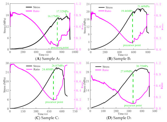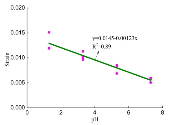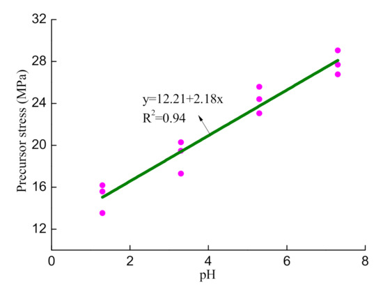 In conclusion, the turning point of the ratio curve of dissipated strain energy from decreasing to increasing can be used as the precursor of rock failure. As shown in Figure 7, the stress value at the failure precursor point of rock sample A1 is 16.17 MPa, the peak strength is 17.32 MPa, and the ratio of the stress value at the precursor point to the peak strength is 0.93. The stress corresponding to the failure precursor of rock sample B1 is 19.46 MPa, the peak strength is 21.60 MPa, and the ratio of the stress at the precursor point to the peak stress is 0.90. The stress corresponding to the failure precursor of rock sample C1 is 24.40 MPa, the peak strength is 26.87 MPa, and the ratio of the stress at the precursor point to the peak stress is 0.91. The stress value corresponding to the failure precursor of rock sample D1 is 27.69 MPa, the peak strength is 30.75 MPa, and the ratio of the stress value at the precursor point to the peak stress is 0.90. Table 4 shows the stress and strain values at the failure precursor point, the stress and strain values at the peak point, and the ratio of the stress and strain values at the precursor point to the stress and strain values at the peak point. The stress value of the failure precursor points increases nearly linearly, while the strain value of the failure precursor points decreases nearly linearly, as shown in Figure 8 and Figure 9, with the increase of pH. Moreover, as the pH of the solution increases by 1, the stress value increases by about 2.18 MPa, while the strain value decreases by about 0.00123. The linear equation can be used to determine the stress and strain values of the failure precursor point in various acidic solutions.