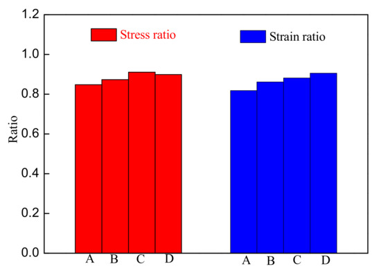 According to Table 4, assess the mean value of each group of rock samples and draw the histogram to evaluate the changing pattern with the pH solution as shown in Figure 10. The ratio of strain to peak strain at the failure precursor point increases with the rise of the pH solution, while the stress to peak stress ratio at the failure precursor point first increases and then decreases. The ratios of the stress value at the failure precursor point to the peak stress of the rock samples of groups A, B, C, and D were 0.848, 0.874, 0.911, and 0.899, respectively. The ratios of the stress value at the failure precursor point to the peak stress of rock samples soaked in different pH acid solutions had little variance, first rising and then decreasing with an increase in pH. Therefore, the authors attempted to use a straight line to fit the ratio of the stress value at the failure precursor point and peak stress of mudstone after soaking in acidic solutions with different pH values. As shown in Figure 11, the ratio of the stress value at the failure precursor point to the peak stress is about 0.883, and there is no obvious relationship between the ratio and the pH value of the solution. Therefore, the rock failure precursor point can be evaluated by testing the uniaxial compressive strength of mudstone, and the evolution state of rock strain energy can be distinguished. When the stress value reaches the rock failure precursor point, the curve of the proportion of the rock’s dissipative strain energy has reached the lowest point, and then the dissipative strain energy will increase rapidly. The crack and fissure will generate and propagate rapidly, and rock failure will occur soon.