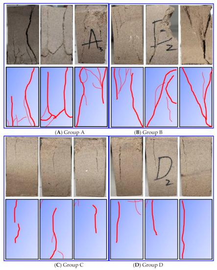 Figure 5 shows the strain energy evolution curve of rock samples corroded by different pH acid solutions during loading. The total strain energy increased the stress-strain curve in the compaction, elastic, and plastic stage. In the compaction stage, the total strain energy increased slowly with the increase of strain, as shown in Figure 5. The total strain energy is the sum of elastic and dissipation energy. The dissipative strain energy increase is higher than that of elastic strain energy. In this stage, dissipative strain energy is consumed by the compaction of primary pores and microcracks. In the elastic stage, the input energy provided by the loading is mainly used for the elastic deformation of the internal structure of the rock sample and is mainly converted into elastic strain energy storage, while the dissipated strain energy is almost unchanged or slightly increased. In the plastic stage, the input energy provided by loading is still mainly stored in the form of elastic strain energy. However, due to a large number of new meso cracks in the rock, the dissipated strain energy increases greatly near the peak strength, due to propagation and connection of meso cracks and macro cracks formed in the sample. After the peak strength, a large amount of elastic strain energy stored in the rock is released rapidly, while the dissipated strain energy increases rapidly. A large amount of dissipated strain energy is dissipated by plastic deformation, macro crack penetration, and slip dislocation of macro crack surface, and the rock strength gradually loses energy. The same trends of accumulation, transformation, and damage mechanism were observed for different groups. However, the difference in pH of the chemical solution will inevitably lead to the obvious difference of strain energy value at peak strength. Table 3 describes the statistics of total strain energy, elastic strain energy, and dissipated strain energy at the peak strength points of all rock samples. In order to intuitively reflect the influence of the pH value of the chemical solution on the strain energy value of the rock samples at a peak strength point, the strain energy value of each group of rock samples at peak strength point was taken, and the average value was calculated. The histogram is drawn as shown in Figure 6. The average values of total strain energy of A, B, C and D are 0.1046 g/cm3, 0.1008 g/cm3, 0.009544 g/cm3, and 0.08574 g/cm3, respectively. The average values of elastic strain energy are 0.06461 g/cm3, 0.06612 g/cm3, 0.07113 g/cm3, and 0.06148 g/cm3, respectively. The average values of dissipated strain energy are 0.03994 g/cm3, 0.03472 g/cm3, 0.02431 g/cm3, and 0.02426 g/cm3, respectively. The total strain energy at the peak strength point decreases with the increase of pH, the elastic strain energy first increases and then decreases with the increase of pH, and the dissipative strain energy decreases with the increase of pH. However, low acidity (pH 5.3 and 7.3) shows a slight effect on the dissipative strain energy at the peak strength point. This conclusion can also be verified from the failure patterns of the rock samples below. The dissipated strain energy is mainly used for rock damage and fracture development. When pH is 5.3 and 7.3, the failure patterns of rock samples are mainly a tensile failure, and there are few secondary microcracks on the surface.