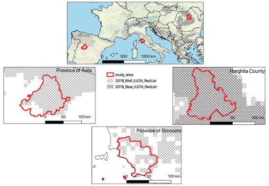 Map of project areas. The distribution of brown bears (Ursus arctos) and wolf (Canis lupus) as estimated by International Union for Conservation of Nature (IUCN) in 2018 are reported in background.