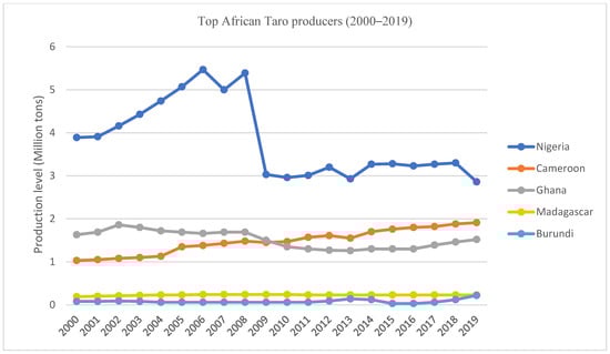 Top 5 African Taro Producers (2000–2019). Source: Authors’ graph using FAOSTAT 2021 data.