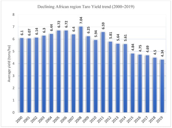 In many parts of the world, (especially, African countries), roots and tubers such as cassava (Manihot esculenta), sweet potato (Ipoemea batatas), yam (Dioscorea sp), and cocoyam (Colocasia esculenta and Xanthosoma sagittifolium), are important staple crops commonly cultivated by smallholder farmers and used as food security and income crops [11,44]. Taro production in Africa (especially SSA) is commonly by smallholder, resource-limited and mostly female farmers [3]. However, the crop is mostly referred to as “poor man’s crop” because its consumption is mainly by the low income households in the society [3]. As mentioned above, Africa contributed to over 70% of global taro production consistently in the past two decades and accounted for about 76 percent of world share in 2000 but, witnessed a slight decline in production levels in two decades attaining 72.27% (7.6 million tonnes) share of world total production in 2019 (Table 10) [11]. Despite the global recognition of taro production in Africa, the crop has suffered serious neglect, receiving little attention from agricultural researchers and government policymakers [3,43,44,45,46].