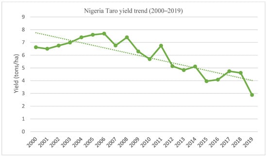 Nigeria’s declining Taro yield with trend line (2000–2019); Source: Authors’ graph using data from FAOSTAT 2021 [11]. Note: The dotted line is the trend line; the solid line is the declining Nigeria Taro yield.