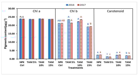 Pigment content in E. vesicaria treated with different foliar sprays of TAM® (5, 10, and 15%), compared with NPK control (TAM® 0%). Different letters in each plotted series indicate significant differences at p < 0.05 using Duncan’s multiple range test. n.s., nonsignificant.