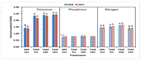 In general, there was no significant variation in nitrogen content in the plants between two years (Table A1). Treatments consisting of 10% TAM® provided the highest nitrogen accumulation in both years, while 15% TAM® and the NPK control showed the lowest value with no significant difference at p < 0.05 (Figure 2). Regarding the phosphorus content, all TAM® treatments showed phosphorus content close to that of the NPK control (Figure 2). However, potassium content increased significantly in the TAM® treatments, mainly with 15% TAM® (2.38% in 2016 and 2.32% in 2017), over the NPK control in both years. The differences were not statistically significant among treatments.