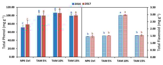 As shown in Figure 3, maximum phenolic content in E. vesicaria was achieved with 10% TAM® (106.38 mg g−1 in 2016 and 105.52 mg g−1 in 2017), while there was no significant difference between 5% and 15% TAM® treatments. On the other hand, the lowest phenolic content was provided by the NPK control. Likewise, treatment with 10% TAM® showed the highest total flavonoids (2.94 mg g−1 in 2016 and 2.97 mg g−1 in 2017), while the control, 5% and 15% TAM® were comparable. It was observed that there was no significant variation in phytochemical content in both studied years (Table A1).