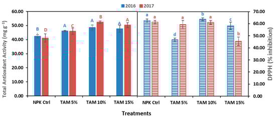 The highest DPPH inhibition was achieved by 10% TAM® (63.63% in 2016), which was a little higher than the NPK control. However, 5% and 15% TAM® showed a lower DPPH scavenging activity than the NPK control in 2016, while in 2017, 5% TAM® showed comparable results with NPK treatment. Compared to the activity shown by the NPK control treatment, 10% TAM® showed the maximum total antioxidant activity (Figure 4). The highest total antioxidant activity was achieved with 10% TAM® (48.59 mg g−1 in 2016 and 52.43 mg g−1 in 2017), while the lowest activity was achieved with the NPK control. The same trend of antioxidant activities was observed in both years with no significance (Table A1).