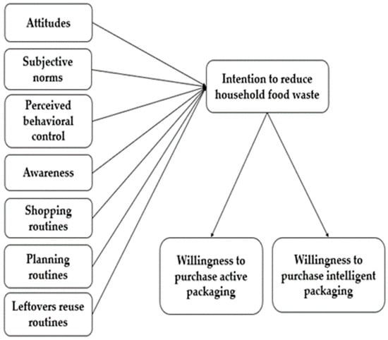 The structural model of intention to reduce household food waste and willingness to purchase active and intelligent packaging.