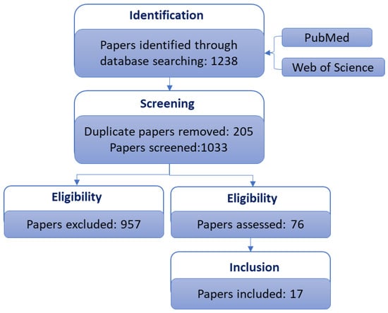 Research on existing literature over the past decade produced a total of 1238 papers. Since more than one database was used, the search returned some identical documents, so before anything else, it was necessary to remove the duplicates; there were 205 of these. Subsequently, through the use of Rayyan Review, it was possible to evaluate and select the titles and abstracts of 1033 papers using two external reviewers and using a third for the documents on which they disagreed. Therefore, referring to the focus of the study, a further 957 papers were discarded as being not pertinent. Consequently, on only 76 papers was a complete analysis of the entire study carried out, and of these, another 59 papers were eliminated because they were (1) unrelated, (2) papers that report the same results as previous studies, or (3) reviews on past literature (for more information, please see the supporting information file). In total, 17 documents were taken into consideration for this review, as they were the only ones to meet all of the above criteria (language, publication date, originality, and relevance to the theme of the review). The main results are presented in Table 2 for the hydrological performance, in Table 3 for the removal efficiency of conventional pollutants, and in Table 4 for observations on the durability of the functional objectives of the PPS. Figure 2 shows a flowchart of the process of recruiting elected papers for systematic review.