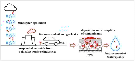 A critical design objective for urban rainwater management is the protection of flow paths and natural water balances. Achieving this goal is aimed at preventing and mitigating disruptions in natural processes, which in turn contributes to making flow systems unhealthy. New planning techniques and engineering systems can help in the economic, environmental, cultural, and social impacts associated with urban stormwater. An increasingly accepted approach to address the challenges of stormwater design and management is the implementation of so-called LID (low impact development). This represents a design philosophy that encompasses planning methods and rainwater-management technologies in order to reduce as much as possible the negative impacts deriving from urban rainwater, such as the degradation of the quality of underground and surface water, the loss of recharge and aquatic biodiversity, floods, and erosion [1,2]. Rainwater management is also important regarding the pollutants it carries deriving from anthropogenic activities and environmental processes. For example, the suspended materials from vehicular traffic, tire wear, and oil and gas leaks from vehicles are deposited on pavements, and all of this material is carried by rainwater and infiltrates between the surface of permeable pavement and the other base layers, accumulating over time. The pollutants most detected are total suspended solids (TSS), metals, hydrocarbons, chlorides, bacteria, and nutrients. Furthermore, particular attention must be paid to the discharge of excess nutrients into water bodies as they cause the seasonal eutrophication and algal proliferation phenomena. In fact, high levels of nutrients such as phosphorus cause increased growth of phytoplankton, providing a toxic environment for aquatic animals. Parameters such as temperature and pH are very important and for this reason they are often measured, as they influence the toxicity and solubility of some parameters, such as heavy metals. Permeable pavement systems (PPS) can be a valid strategy to control the polluting loads carried by rainwater. In fact, several researchers have studied PPS’ purifying effects. Researchers have reproduced PPS in the laboratory and studied their removal efficiency on conventional pollutants present in surface runoff. High levels of removal have been found for heavy metals; however, PPS has also been found to effectively remove petroleum, biochemical oxygen demand (BOD), chemical oxygen demand (COD), ammonia (NH3), and total phosphorus (TP). Conversely, low efficiencies were found in permeable asphalt pavement for the removal of chloride (Cl) and total nitrogen (TN). Instead, permeable ceramic brick can effectively purify TSS and TP with values around 79% and 74%, respectively, but it is not very efficient in the removal of BOD, NH3, and TN. However, for the reliable removal of hazardous substances via permeable pavements a more intensive view of the sources is mandatory; several studies have attempted to identify what the sources are for pollution in urban systems [3]. Understanding what the sources are and reducing them is an indirect way of improving the durability in terms of permeability of the PPS. Additionally, like in many fields of environmental management, a combination of different measures at different locations has the most powerful effect. The measures implemented in agricultural/rural landscapes were found to be useful to prevent the pollution of freshwater systems [4,5]. If these measures were implemented at urban sites, there would be the possibility of preventing the transportation of harmful substances whose source is not the pavement itself.