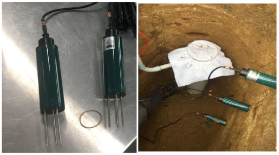 MP406 soil moisture sensor (left image) and sensors implanted in different depth of soil (right image) [37].