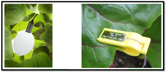 Leaf wetness is a parameter which describes the existence and amount of water on leaf surfaces. The leaf of a plant often intercepts water during fog and dew or rain. Water can also be trapped in a leaf if the plant undergoes excessive irrigation [38,39]. Leaf wetness content provides an optimum benchmark for the moisture status of the entire plant. Knowledge of water status in plants provides farmers with a better perception of drought and its origin [40]. Furthermore, it allows agronomists to regulate the watering method by determining whether crops require water and the needed volume [39,40,41]. Leaf wetness or turgidity is an essential factor for the photosynthetic performance investigation. Thus, it can provide crucial information about the health of plants [40]. Excessive leaf turgidity often leads to the sporulation and occurrence of a range of fungal diseases that can perturb the plant growth. An appropriate understanding of the degree and duration of leaf turgidity allows agronomists to evaluate the right areas and time to adopt protective measures such as deploying fungicides [39]. Leaf wetness sensing devices enable direct estimation of the hydration of plants. Therefore, they offer an effective and potential replacement of the indirect hydration measurement systems through soil moisture or temperature sensors (Figure 5). Such meticulous and self-sustaining devices can prevent plant damage and increase crop yields while conserving water resources [41].