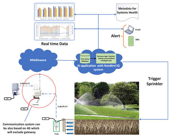 In Figure 8, a smart irrigation system is proposed, where real-time weather data and real-time soil moisture sensor data can be collected and transmitted to servers using LoRaWAN gateway. Soil moisture sensors will collect the moisture level of soil, and the weather sensor will forecast the weather condition. When the soil moisture level goes below a predefined threshold level, and the weather forecast does not show any probability of rain, then AI will make a decision, and the sprinkler will be turned on. Consequently, resources such as water and electricity can be used efficiently, and the probability of overwatering or underwatering can be avoided. To serve this purpose, we propose to create an IoT network consisting of sensors (weather sensor and soil moisture sensor), LoRaWAN gateway, network server, and application server. Using the collected real-time data, an AI based algorithm can be used to make the optimal decision for controlling the automatic sprinkler.