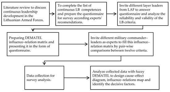 The subsequent structure of this paper is organized as follows. First, the work done by other researchers related to leadership behavior criteria investigations is presented. Then, the research methodology for continuous military leadership behavior investigations and an identification method based on fuzzy DEMATEL is described. Furthermore, we present in detail the surveys conducted in the military to identify main constructs of commander–leader’s behavior on the basis of the leaders’ followers’ assessment by Structural Equation Modeling (SEM) and the fuzzy DEMATEL model when the different level commander–leaders (experts) of the Lithuanian army weigh the same twelve criteria using the pair-wise comparison method. Finally, the outcomes of fuzzy DEMATEL analysis and interpretation of get result in line with previous studies are presented.