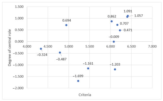 Step 8. Now a structural model has to be established. After evaluation of the cause–effect relationships between pair-wise assessed criteria, the fuzzy DEMATEL investigation finishes with the establishment of a structural model. The causal diagram in DEMATEL analysis presents the causality between assessed criteria can be established by mapping the dataset of the calculated rate (D + R) and (D − R). The data set of (D + R) values representing the horizontal axis was calculated by summation of the D with R, and the data set of (D − R) illustrates the vertical axis; these values were completed by subtracting D from R. The value (D + R) represents the power of influence between the criteria and depicts the significance or importance degree of each criteria, with high values representing the high powers of influence. The values of the (D − R) data set show the relation of the criteria by causality, and represents the reciprocal effect by which the criteria are divided into a cause or an effect group. The positive (D − R) values specify that the criteria belong to the cause group, and according to the value weight, the power of influence can be identified; the higher the value, the greater the influence. Additionally, negative values (D − R) can define the effect group criteria [44]. Finally, taking into account all of the explanations mentioned above, the causal diagram can be constructed to illustrate the criteria’s sense in relationships.