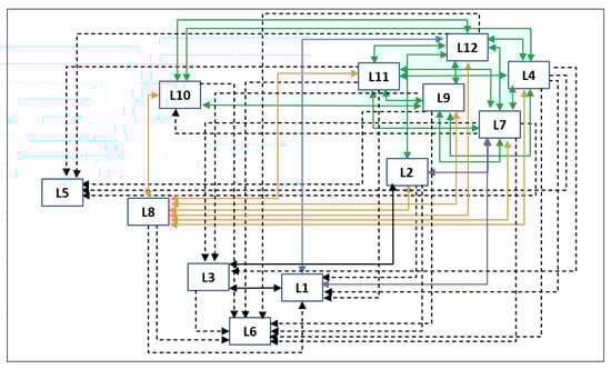 On the basis of the measures in the total relation matrix, we can see the common connections between the twelve leadership behavior constructs. Additionally, to predict the appropriate relation and to eliminate confusion in the description of the influence–relations map, the threshold number was calculated as the mean average [44]. In this study, the threshold value was equal to 0.237.