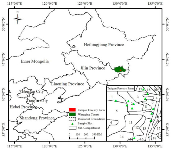 The study area is located in Tazi Gou Forest farm (129°56′–131°04′ E, 43°05′–43°40′ N), Wangqing Forestry Bureau, Jilin Province, China (Figure 1). This region is dominated by low mountains and hills, with an altitude between 300–1200 m and a slope between 5° and 25°. It belongs to a temperate continental monsoon climate with an annual average temperature of about 3.9 °C and annual precipitation 600–700 mm, mostly in summer. The lowest temperature is about −32 °C in January and the highest temperature is about 22 °C in July. The area is mainly dark brown soil with fertile soil texture, acidic pH, and high humus content. The main tree species are Q. mongolica, Betula platyphylla, Pinus koraiensis, Acer pictum, Tilia mandshurica, Populus ussuriensis, Larix olgensis, Betula dahurica, Fraxinus mandshurica, Abies nephrolepis, Ulmus davidiana var. japonica, Picea jezoensis, and Phellodendron amurense, among others.