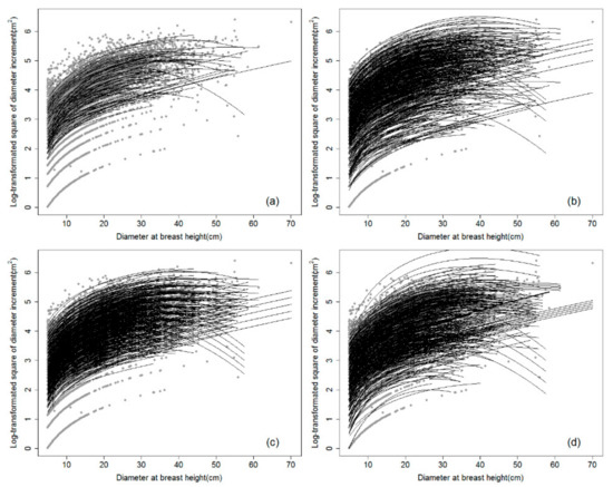 Therefore, the two-level mixed effect model of individual tree diameter growth of Q. mongolica secondary forest was finally determined as (Equation (14)):