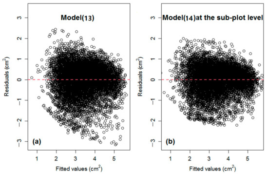 The results showed that the variable D was the most important factor affecting the diameter growth, and the influence of the other 7 variables on the diameter growth from large to small order is as follows: CW, aCI, CS, CR, SDI, SC, and Hegyi. CW, CS, and CR were positively correlated with the diameter growth, while the other 5 variables were negatively correlated. The regression coefficient of SPI is not significant, so this index was not considered in the model construction. The results show that the mixed effect model has better prediction results, and the prediction accuracy based on the sample plot level nested in the tree species level is the highest, with RMSE of 0.6907 and R2 of 0.6210. It can be seen from the distribution map of the predicted values and residuals (Figure 3) that there is no obvious heterogeneity in the distribution of residuals, which indicates that the two models have good prediction results, and model (14) is obviously better than model (13).