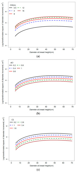 Effects of CW (a), aCI (b), and CS (c) on the diameter increment of individual trees. The curves were produced using parameter estimates of model (13). The mean values of the observed data were used for other variables rather than the variable shown varying (lowest to highest range in the observed data).