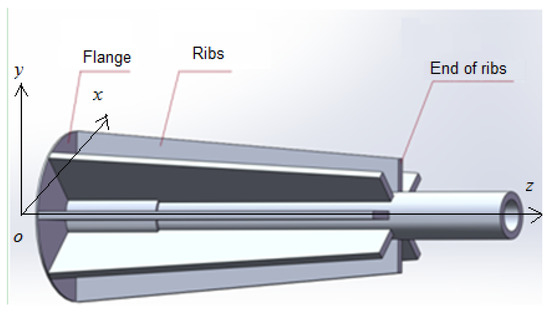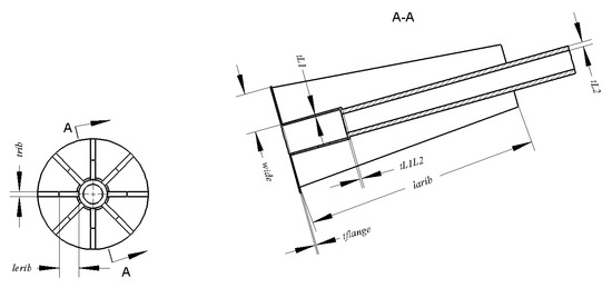 Circular tubes with ribs arranged around the outside are universal in production, such as mirror tubes [34,35] and beams. At the beginning of modeling a tube structure, the number of ribs which is most suitable is unknown. Too many ribs will increase the calculation time of ANSYS, the processing time, and the difficulty of processing the tube. According to general production practice, the number of ribs ranges from 0 to 20. In this range, a tube with eight ribs was selected, in order to optimize its structure, in this study. The length of the tube and the size of its inner circumference were fixed based on the requirements of the parts that are usually held by the tube. The structural parameters that could be changed are as follows: the wall thickness of the tube, the thickness of the flange, the diameter of the outer circle of the flange, the length of the other end of the rib, the length of the rib in the axial direction of the tube, the thickness of the rib, and the number of ribs around the tube.