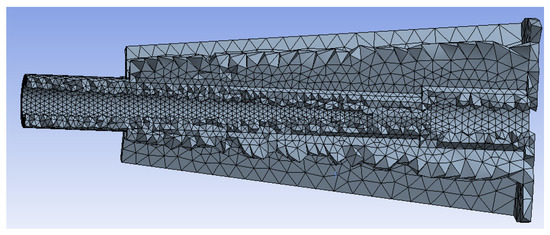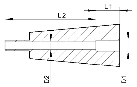 The overall structure of the tube was obtained based on the sizes of the circular parts held in the tube and its part length or working path, as shown in Figure 5. The inner diameters of the tube were D1 = 30 mm and D2 = 20 mm. The tube lengths were L1 = 62.9 mm and L2 = 243.4 mm. The tube was constructed from aluminum alloy 6061. The properties of the material were follows: density kg/mm, Young’s modulus MPa, Poisson’s ratio = 0.332, yield strength = 55 MPa, tensile ultimate strength = 310 MPa, and shear modulus = 25,601 MPa. These were fixed values, and the remaining structural parameters were variable.