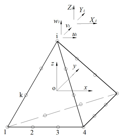 where , and , , and are the displacement of the node i in the x, y, and z directions, respectively, as shown in Figure 3.