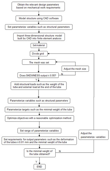 CAD was used to model the tube structure in three dimensions and set the parameter values. The parameterized 3D model built using CAD software was imported into finite element analysis software [31]. In ANSYS, the extreme value of the deformation was set, and ranges of the structural parameters were selected. The design variables were structural parameters. In ANSYS, the MOGA optimization method was selected to design a tube such that its weight was minimized and the deformation met specific requirements [32,33]. Finally, the structure was optimized by finite element analysis. The specific process is shown in Figure 4.