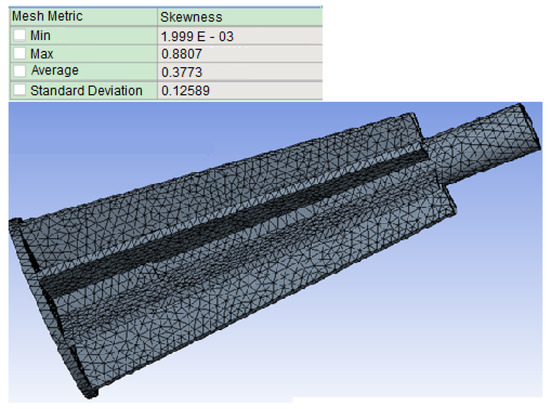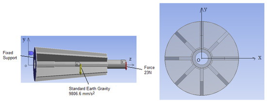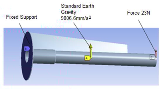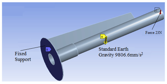 After defining the parameters, the 3D model built in SolidWorks was imported into the finite element analysis software. The tube material was set, and the mesh was generated based on the quality requirements of the analysis. When the analysis results no longer changed with the size of the mesh, the mesh was no longer refined. The mesh quality was checked using the SKEWNESS function in ANSYS, with values between 0 and 1. SKEWNESS outputs 0 for the best mesh quality and 1 for the worst, and a mesh quality of 0.95–1 is unacceptable. The result of this meshing structure is shown in Figure 7. It met the mesh quality requirements for the computational analysis. The bottom surface of the flange was fixed. In an actual design, the working load of the structure under the worst conditions is taken as a fixed value for the design variables of the structure. If this worst working condition is met, loads under other conditions will also meet requirements of the structure. Based on the working force, the tube was subjected to its own weight (the force was applied in the direction). In the worst condition, the end of the tube was subjected to an external load of 23 N (in the direction), as shown in Figure 8. The operating acceleration of the tube as well as the buckling and torsion on the structure were neglected in this study. In other working conditions, if the buckling and torsion effects are large, these loads can be added to the structure and subsequently analyzed and optimized using the flowchart of the structure optimization procedure shown in Figure 4. Appropriate size ranges for the arguments based on the process and actual conditions were set to the values shown in Table 1.