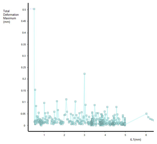 Through finite element analysis, the relationship between the deformation of the tube and the input parameters was obtained. For parameter tL1, within the range of 1–6 mm, the variation of the deformation of the tube with the input parameters is shown in Figure 9. At tL1 = 0.5 mm, the deformation had a maximum value of 0.5 mm. At tL1 = 3 mm, the deformation was about 0.25 mm, and the deformation was also large. Other parameters changed the deformation by mm. There was no evident variation trend, but the maximum deformation should be avoided. For parameters wide, tflange, tL2, tL1L2, trib, larib, and lerib, the variation behaviors of the deformation of the tube with the input parameters were similar to that of tL1. When wide = 15 mm, tflange = 1 mm, tL2 = 1 mm, tL1L2 = 1 mm, larib = 100 mm, lerib = 0, and trib = 1 mm, the deformation had a maximum value of 0.5 mm. There were no evident variation trends, but maximum deformation should be avoided.