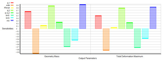 As shown in Figure 10, the parameters that had a significant impact on the weight were as follows: tL1, tL2, and trib. The less influential parameters were tflange and tL1L2. The effects of the input parameters on the weight and deformation followed similar trends.