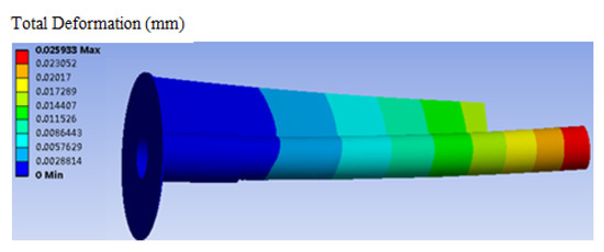 A set of parameters optimized by the multi-objective genetic algorithm is shown. Under the minimum weight constraint and the requirement that the deformation was mm, the parameter combinations were as follows: tL1 = 3.08 mm, wide = 41.71 mm, tflange = 3.13 mm, tL2 = 2.05 mm, tL1L2 = 3.18 mm, larib = 295.08 mm, lerib = 32.98 mm, and trib = 1.69 mm. Furthermore, the geometry mass = 0.643 kg and total deformation maximum = 0.00978 mm.