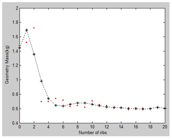 Effect of number of ribs on weight. The red points represent the weight with different numbers of ribs obtained from the simulation. The * points represent the weight with different numbers of ribs on the lines.