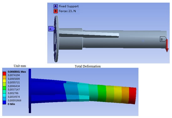 A test was conducted in which the tube was fixed on a large, stable working platform, as shown in Figure 15. A micron gauge was placed at the end of the tube, and a force of 23 N was applied perpendicular to the direction of the rotation axis of the tube using a force gauge opposite to the micron gauge. After the measurement, the end deformation of the tube was 0.0082 mm.