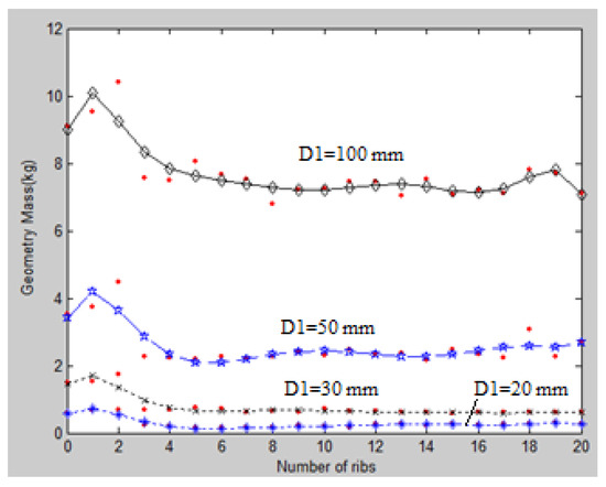 Effect of number of ribs on the weight. The red points represent the weights with different numbers of ribs obtained by the simulation. The other symbols represent the weights with different number of ribs on the lines.