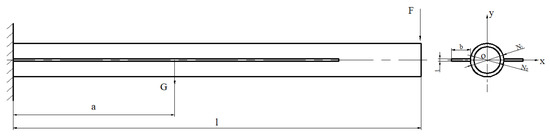 In this arrangement, the side of the rib is parallel to the x-axis and vertical to the direction of the load, as shown in Figure 18. is the moment of inertia about the x-axis of the annular cross-section of the tube and is the moment of inertia about the x-axis of the rectangular cross-section of the rib. These are defined as follows: