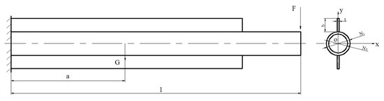 The parameters F, E, l, , and were specified. F is the load, E is the Young’s modulus, l is the total length of the tube, a is the distance from the tube’s center of gravity to the fixed end, I is the moment of inertia, is the outer diameter of the tube, and is the inner diameter of the tube. A reasonable arrangement of the tube cross section at any x position can ensure that the weight is minimized under the minimum cross-sectional area while keeping I the same to achieve the same maximum deformation requirements. To increase the bending rigidity of the tube, ribs were added around the tube. There are two extreme conditions for the arrangement of the ribs: (a) the side of the rib must be parallel to the x-axis, as shown in Figure 18; and (b) the side of the rib must be parallel to the y-axis, as shown in Figure 19.