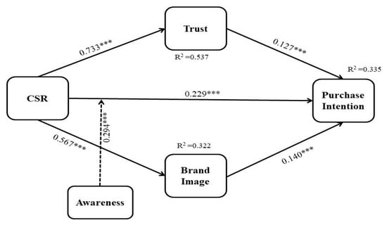 Similar to [133], with a 1000 re-samples bootstrap, a 95% confidence interval was obtained for the indirect effects. The results of a mediation analysis established the role of mediation of brand image and trust in the relationship between CSR and purchase intentions. Table 6 describes the PLS bootstrapping results.