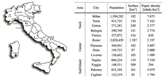 Figure 1. The Italian cities considered in the application case study (source: processing starting from [44]).