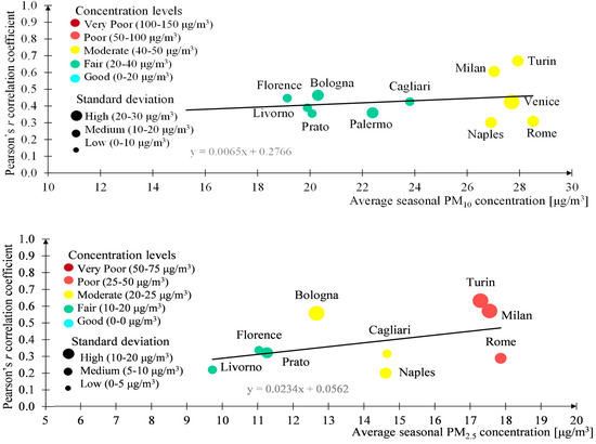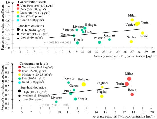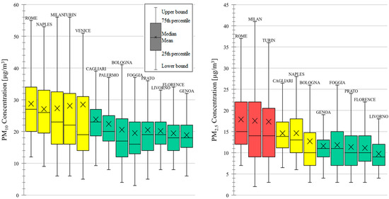 Average PM10 and PM2.5 concentrations measured within the main Italian cities (source: [45]).