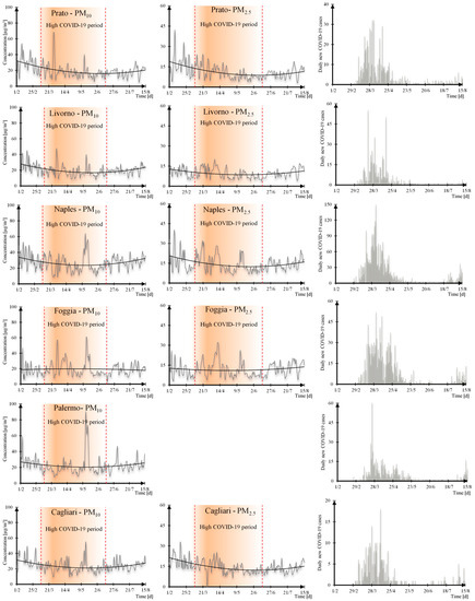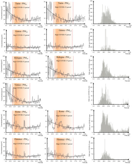 - the PM10 and PM2.5 concentrations measured by the Italian Regional Environmental Protection Agency (ARPA, 2020) at an urban scale [45];