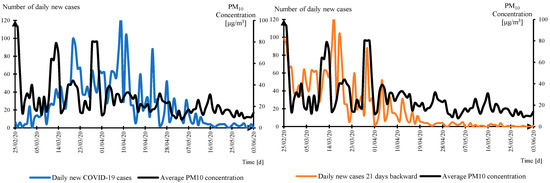 As mentioned, one of the main aims of the research was to perform a correlation analysis to verify the hypothesis, according to which the number of certified cases of coronavirus in a day is directly related with the particulate matter (PM10 and PM2.5) concentrations measured several days before. To estimate the most representative number of “days before” that influences the daily COVID-19 cases, many thresholds were tested in terms of correlation indices estimation, demonstrating that 21 days before (ranging from 18 to 26 days, function of the city considered) was on average the best time period to reproduce the data observed (see results in Table 2). This result is also qualitatively observable from Figure 5, in which it may be seen that the daily coronavirus cases shifted three weeks backward (left axis of Figure 5) and a similar trend of the daily PM concentrations was reproduced (right axis of Figure 5).