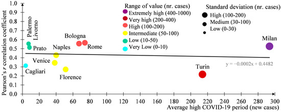 The second correlation analyse performed was the relationships between daily PM concentrations and mobility trips. The estimations results (Figure 7 and Table 3) showed a positive correlation between road traffic (mobility trips) and PM pollution, confirming that PM is mainly produced (emitted) by the road vehicles at an urban scale, as reported in the literature. This phenomenon is most evident for the cities structurally more polluted (red and yellow dots in Figure 7), for which high levels of PM concentrations are mainly produced by road networks with high traffic congestion. This occurs, for example, for Milan and Turin which have a positive high correlation index between road traffic and PM concentration than those less polluted cities (e.g., Pearson’s correlation values equal to 0.6–0.7).