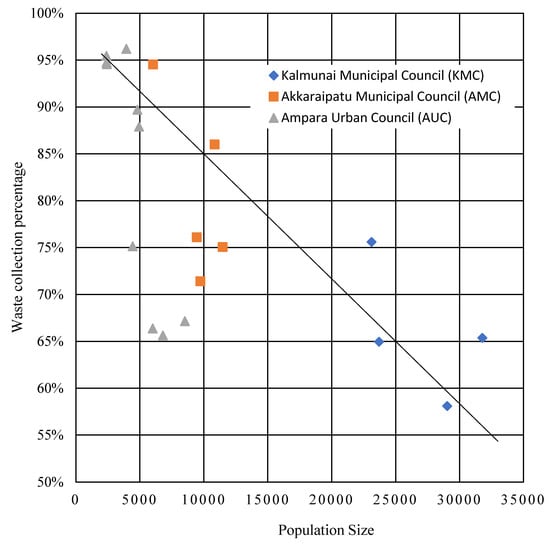Table 2 presents demographic details for all the three study locations. Due to higher population density (which is more than ten times that of the average divisional population density of Sri Lanka) and rapid economic growth after the end of the civil war in 2009, the quantities and types of solid wastes generated within the municipality/urban locality have been rapidly increasing. KMC is the responsible local authority for managing solid wastes generated within the Kalmunai Municipality region. The municipality’s area is divided into 13 urban areas and villages, but waste collection is carried out in 8 urban and suburban areas. Further, KMC is divided into four zones (Zones A to D), AMC into five zones (Zones A to E), and AUC into 10 zones (Zones A to J) for managing solid waste collection. According to the SWM division of respective local authorities, solid wastes have been collected from 45,000 households in KMC, 12,232 households in AMC, and 6983 households in AUC.