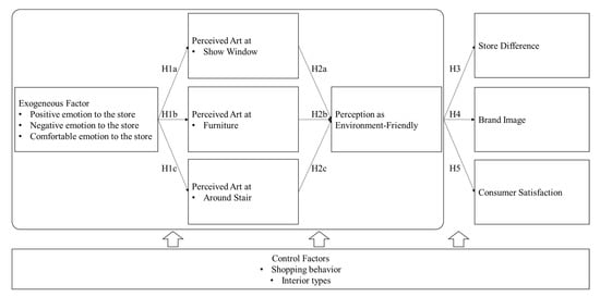 The precedents (i.e., control variables, perception of art in the show window, perception of art around the furniture, perception of art around the stairs, and the consumers’ perception of the store as environment-friendly) are associated with the consumers’ perceived store differences.