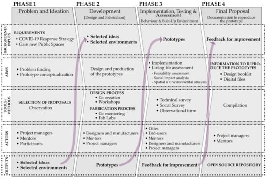 In general, the proposed phases are consecutive, although some overlaps might be recorded. The model does not include the commercialization process, as it is focused on projects whose profits are generated in terms of social impact, value, and return. Hence, in the case study in which the model was applied, this last phase consisted of incorporating the results and the products in an open-source repository.